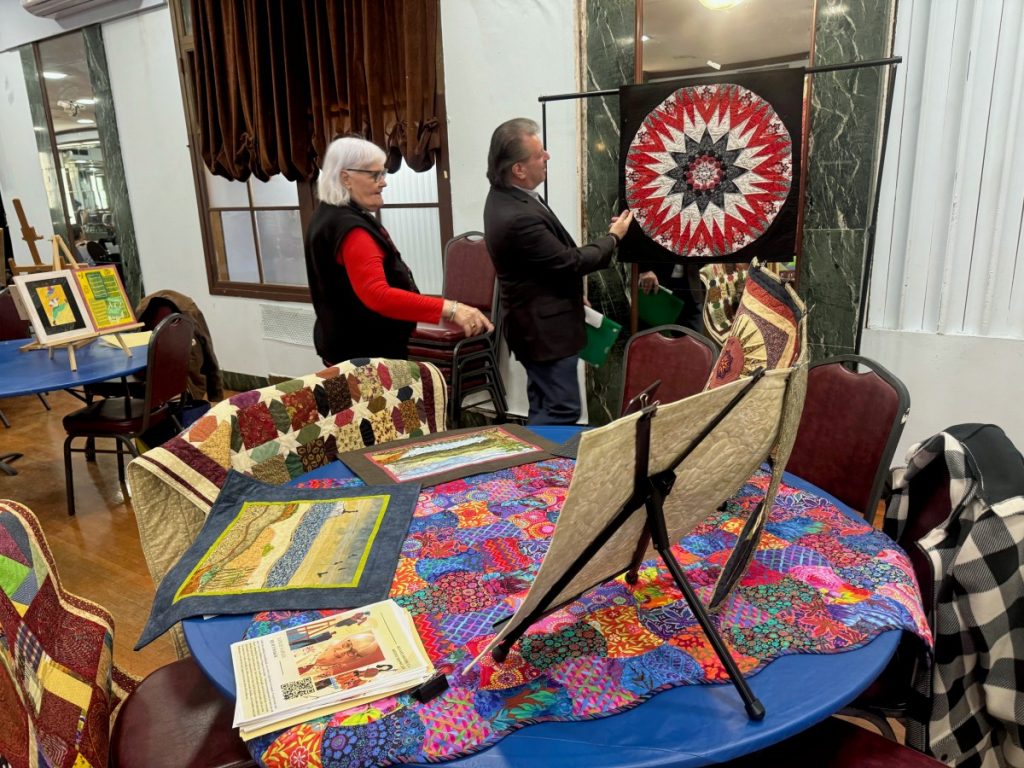 Senator Addabbo admires Louise Naples’ handmade quilts.