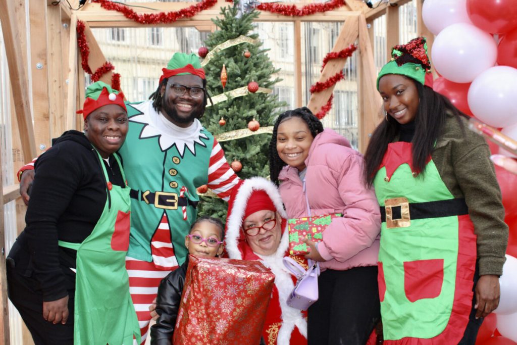 Dale Charles, AKA Mrs. Clause is joined by her elves, and starry-eyed group youngsters after receiving presents on the Mattress-Stuy Winter Wonderland Christmas on the intersection of Fulton Avenue and Marcy Avenue.