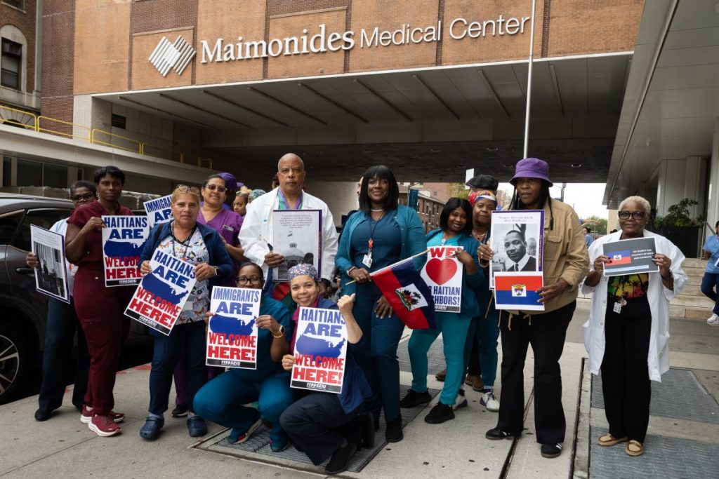 On the rally at Maimonides Medical Middle, 1199SEIU healthcare staff stood in solidarity with their Haitian coworkers, condemning Trump’s rhetoric.