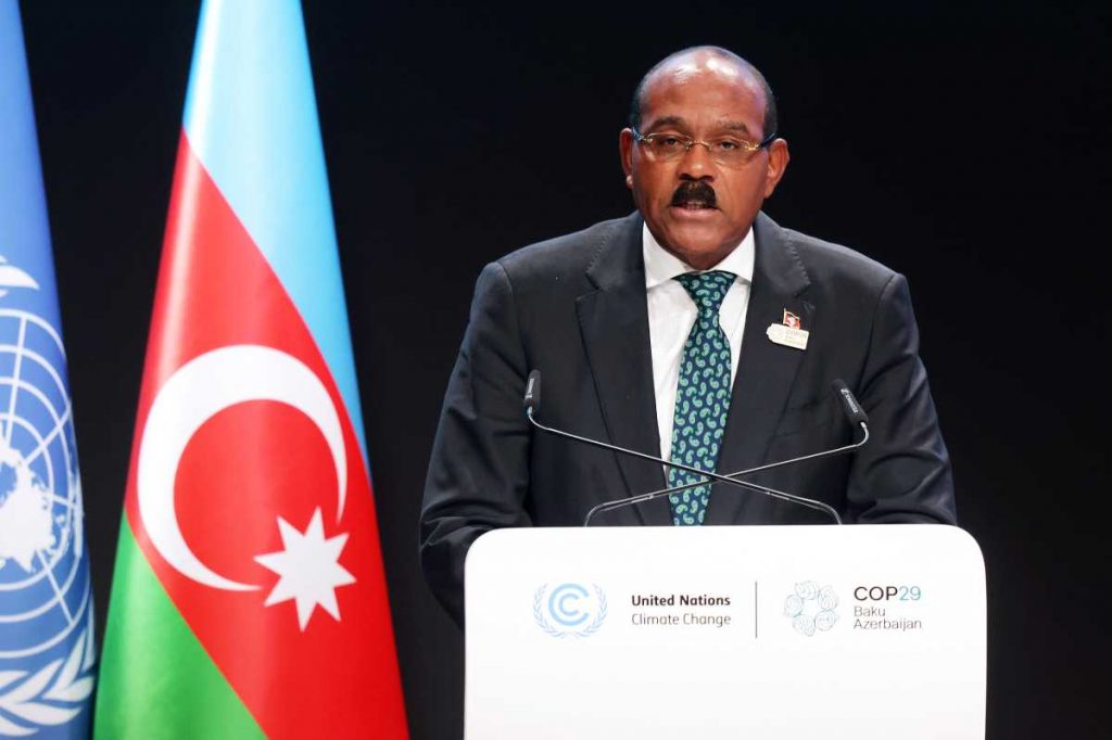 Antigua and Barbuda Prime Minister Gaston Alphonso Browne delivers a nationwide assertion in the course of the excessive stage phase on day three of the UNFCCC COP29 Local weather Convention at Baku Stadium on Nov. 13, 2024 in Baku, Azerbaijan.