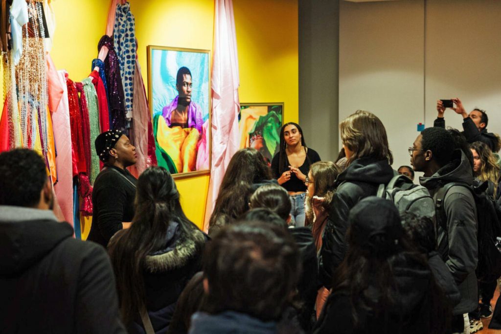 Yvena Despagne (on the left), curator of BYENVENI, takes college students on a preview tour of