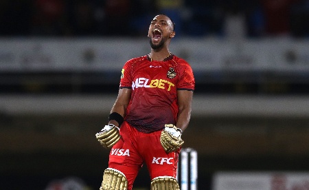 Keacy Carty scored an unbeaten 27 from 13 balls, and captain Kieron Pollard, who ended on 19 not out, then blundered 40 runs off the final three overs to finish the innings in grand fashion.