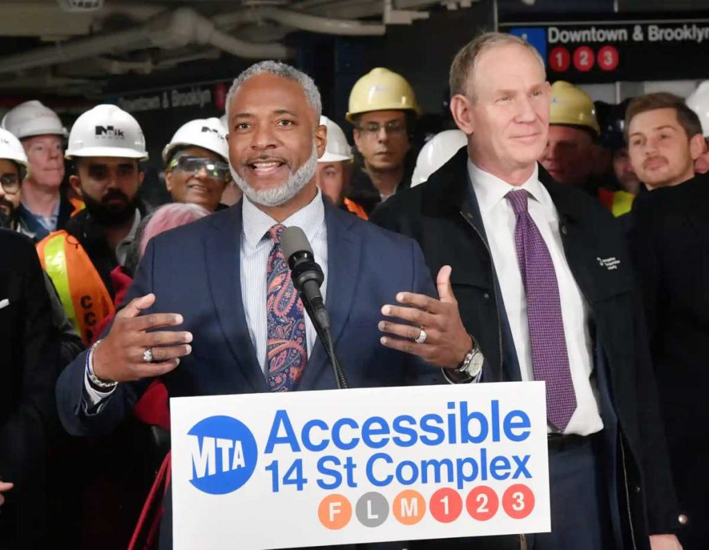 MTA New York Metropolis Transit President Demetrius Crichlow with MTA Chair and CEO Janno Lieber at a Dec. 19, 2024 press convention on the 14th Road station on the 1/2/3 traces in Greenwich Village.