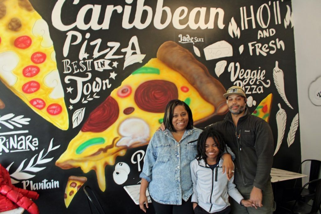From left, Trinidad native Natalie Lamming, and Grenadian native Davis Alexander, pose with 11-year outdated Sebastian, proprietor of Spices & Slices at 1828 Nostrand Ave., Brooklyn, a Caribbean fashion pizzeria.