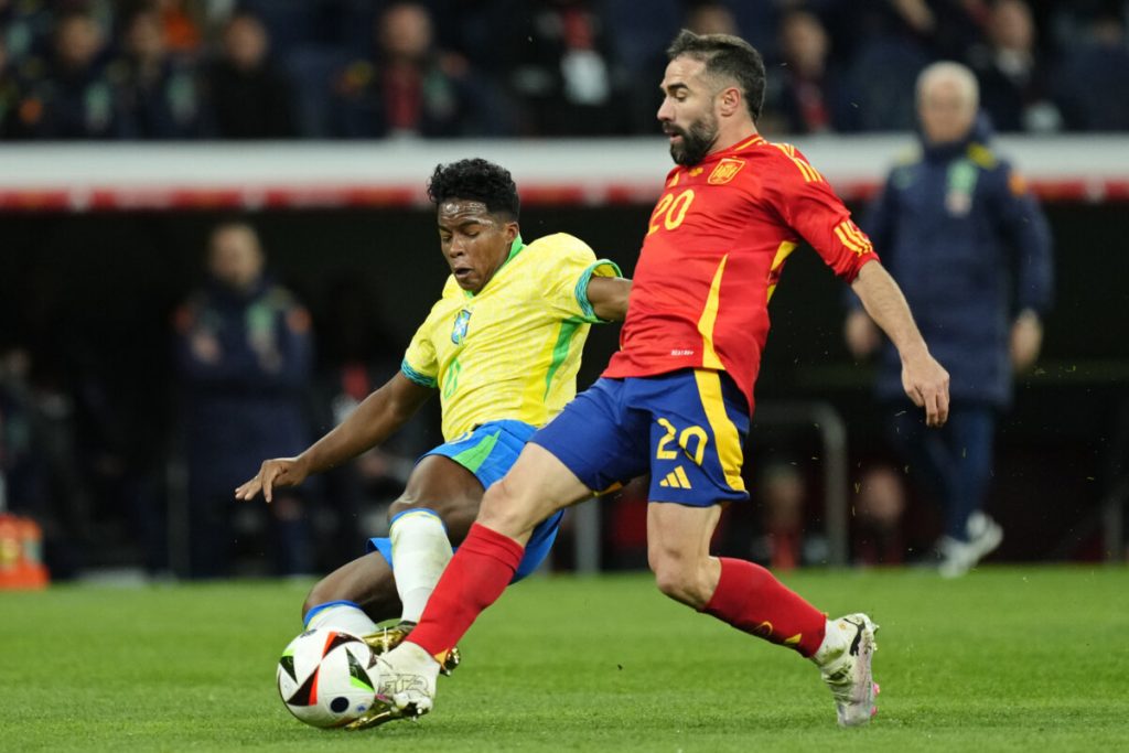 Brazil’s Endrick, left and Spain’s Dani Carvajal problem for the ball throughout a pleasant soccer match between Spain and Brazil on the Santiago Bernabeu stadium in Madrid, Spain, Tuesday, March 26, 2024.