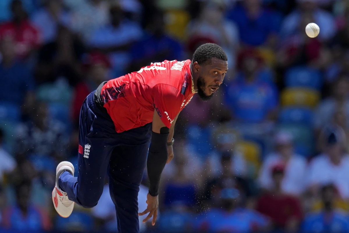 England’s Chris Jordan bowls the supply to get a hat-trick by dismissing the US’ Saurabh Nethralvakar through the ICC Males’s T20 World Cup cricket match between the US and England on the Kensington Oval in Bridgetown, Barbados, Sunday, June 23, 2024.