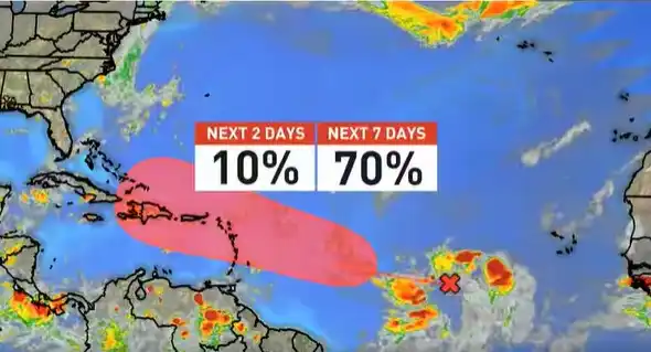The Nationwide Hurricane Middle is monitoring the following tropical wave, which is transferring into the Central Atlantic at current and has a 70% probability of creating right into a tropical cyclone Ernesto over the following week. The system is anticipated to probably affect the Caribbean islands, given its present path.