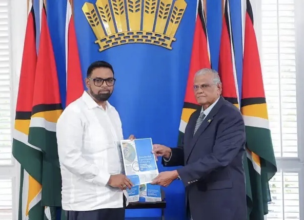 Throughout a ceremony at State Home –Chairman of the Fee Main Basic (Ret’d) Joe Singh handed the report back to Ali, accompanied by the opposite commissioners, lawyer Dr. Kim Kyte-Thomas, and Chairman of the Nationwide Toshaos Council (NTC), Derrick John.