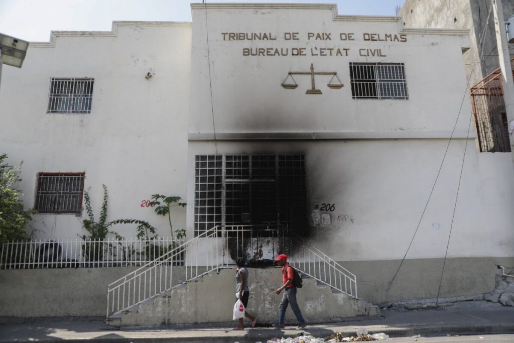 Pedestrians stroll previous a courtroom constructing that was set on hearth by gangs moments earlier than within the Delmas 28 neighborhood of Port-au-Prince, Haiti, Wednesday, March 6, 2024. (AP Picture/Odelyn Joseph)