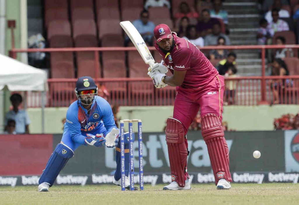 West Indies Kieron Pollard proper bats as India wicket keeper Rishabh Pant seems on throughout their third T20 worldwide cricket match in Windfall, Guyana.
