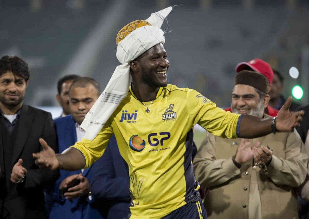 Former West Indies Captain Darren Sammy gestures sporting a conventional turban at Gaddafi Stadium in Lahore; Pakistan.