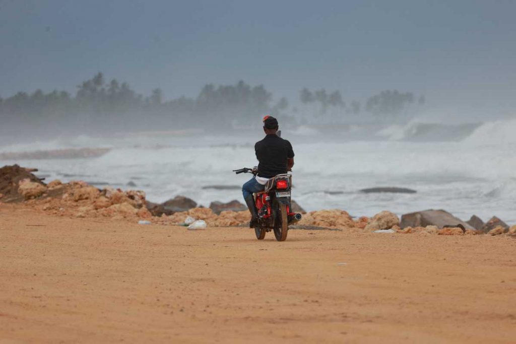 A person rides a motorbike on the seashore, following the passage of Erin, the primary hurricane of the 2025 Atlantic season, in Nagua, Dominican Republic on Aug. 17, 2025.