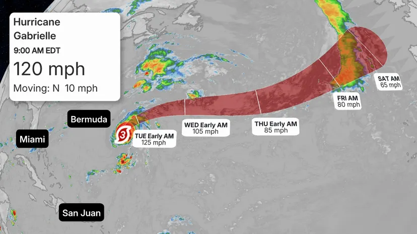 The Miami-based Nationwide Hurricane Middle (NHC) reported that Gabrielle’s most sustained winds climbed to 120 mph, making it a harmful main hurricane. As of Monday afternoon, the storm was positioned about 195 miles southeast of Bermuda and shifting north at roughly 10 mph.