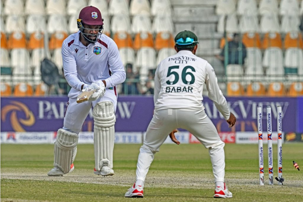 West Indies’ Mikyle Louis (L) reacts after getting clear bowled by Pakistan’s Sajid Khan in the course of the third day of the primary Check cricket match between Pakistan and West Indies on the Multan Cricket Stadium in Multan on Jan. 19, 2025.