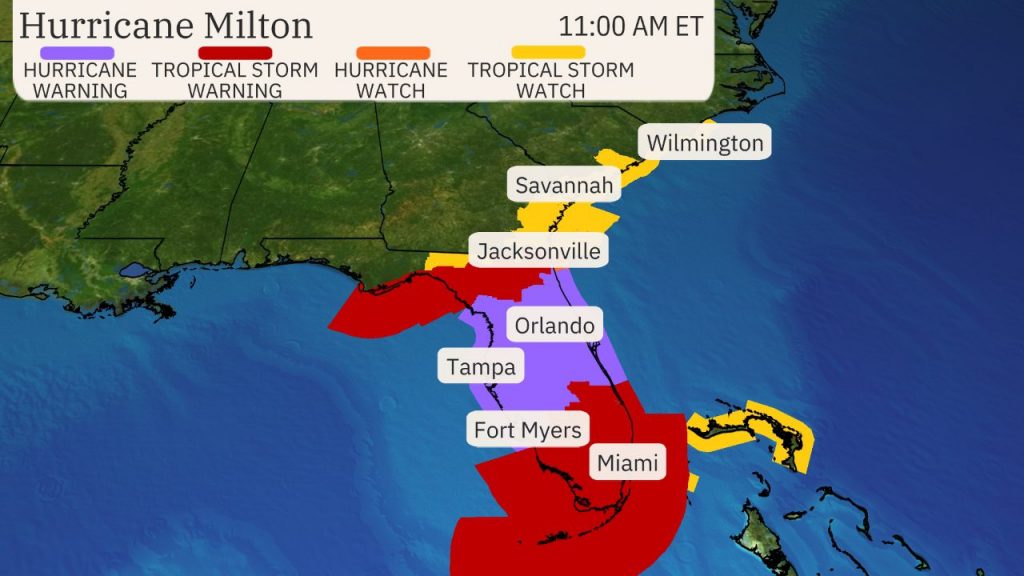 Hurricane warnings are in impact for a lot of central Florida, together with the Tampa Bay space, Fort Myers, Orlando, and Daytona Seaside. This implies hurricane circumstances (sustained winds of 74 mph or increased) are anticipated inside the warning space typically inside the subsequent 36 hours. Numerous tropical storm watches and warnings cowl different elements of Florida, southeast Georgia, and southern South Carolina.