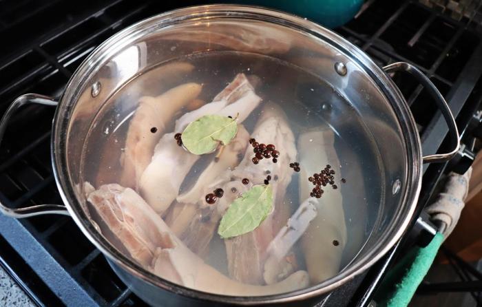 Drain and put aside. This won’t solely assist tenderize them, it would take away a lot of the salt it was cured in.