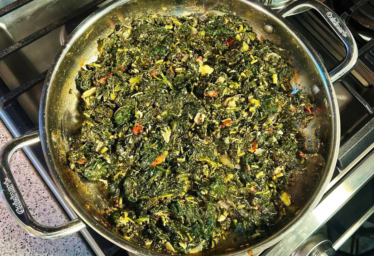 Stir within the ready callaloo leaves, increase the warmth, and permit them to wilt.