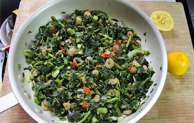 Sautéed callaloo greens and shrimp in garlicky, fragrant herbs make this a comforting, flavorful Caribbean dish.