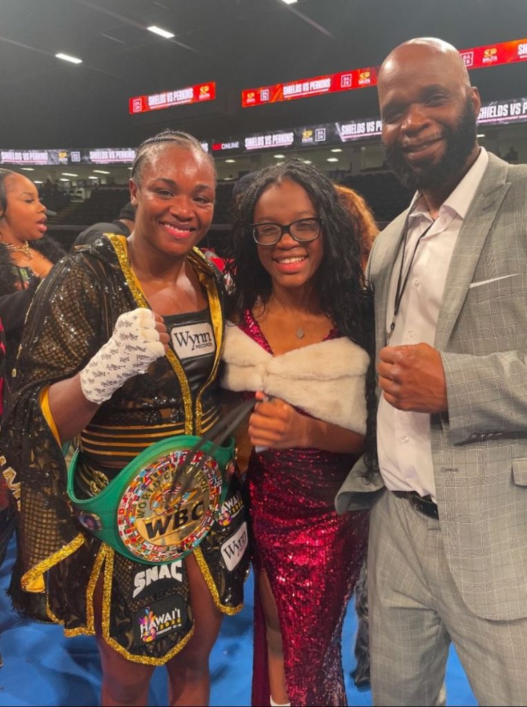 Heavyweight boxing champion Clarissa Shields, left, shares lens time with 12-year-old Jamaican-Canadian singing/performing prodigy Jazmin Headley and her dad Mark Headley at Sunday’s girls’s boxing title match between Danielle Perkins and Shields.