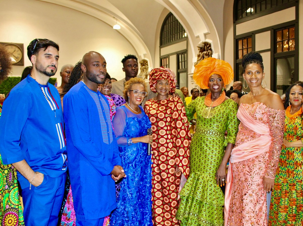 Nigerian-born, Nonya Anyadiegwu, creator of Noni Types placed on an distinctive eleventh Annual vogue present at Main Owens Neighborhood Heart, male fashions, left with emcee Sharon Gordon, and Nonya, fourth from left and different fashions carrying her designs.