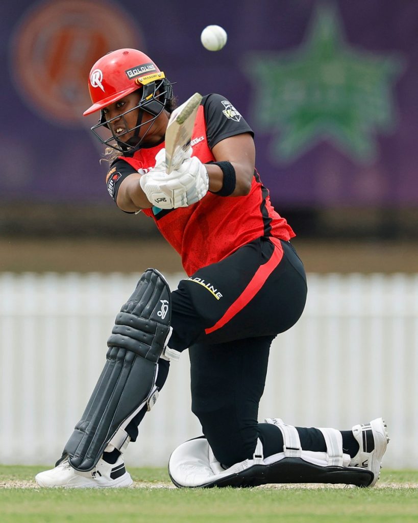 Hayley Matthews of the Renegades hits a six throughout the WBBL match between Melbourne Renegades and Sydney Thunder at CitiPower Centre on Nov. 23, 2024, in Melbourne, Australia.