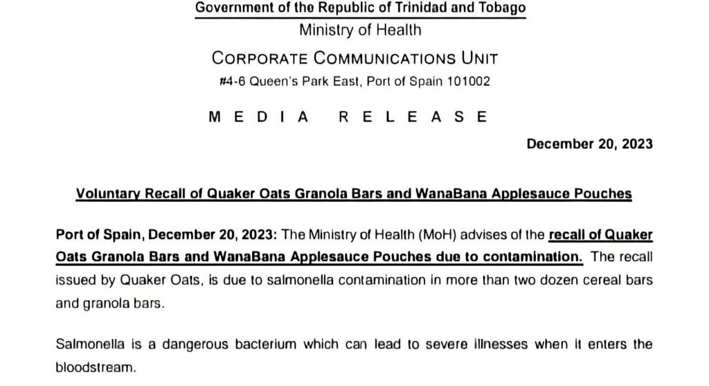 Trinidad and Tobago: The Ministry of Well being of Trinidad and Tobago issued a media launch for the voluntary recall of Quaker Oats granola bars and WanaBana applesauce pouches resulting from attainable contamination on Wednesday, 20 December.