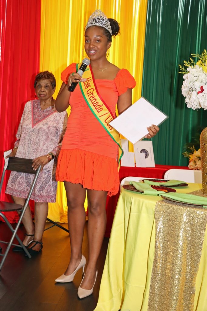 Mickalia Forrester-Ewen, Miss Grenada USA addressed ceremony at Nutmeg Home, with Cecily Mason, president of the Grenadian-American Ex-Teacherss Affiliation in background.