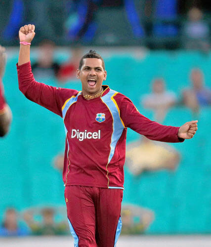 West Indies Sunil Narine celebrates taking the wicket of Australia’s Aaron Finch throughout their One-Day Worldwide Cricket match in opposition to Australia in Sydney, Australia, Friday, Feb. 8, 2013.