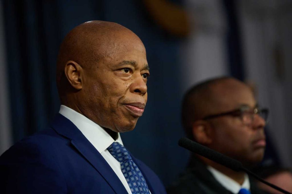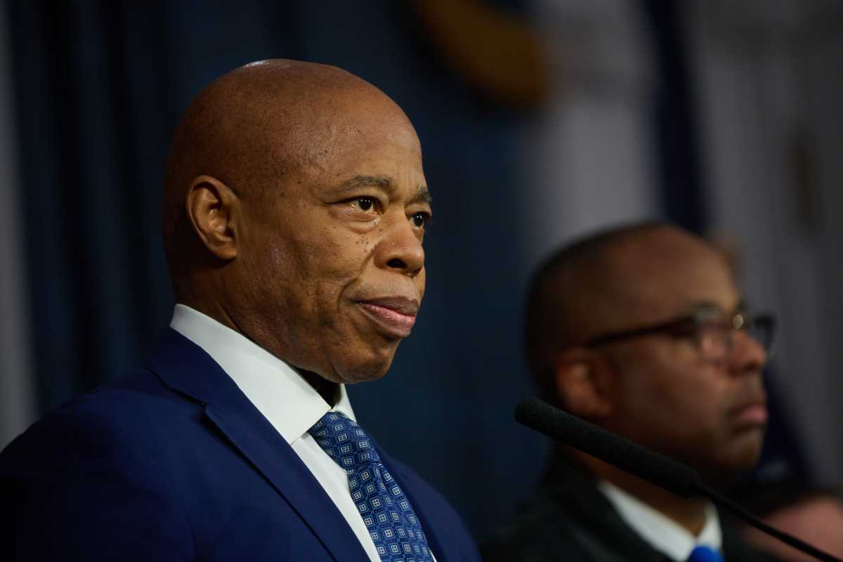 Mayor Eric Adams at a press convention at Metropolis Corridor on Might 6, 2025.