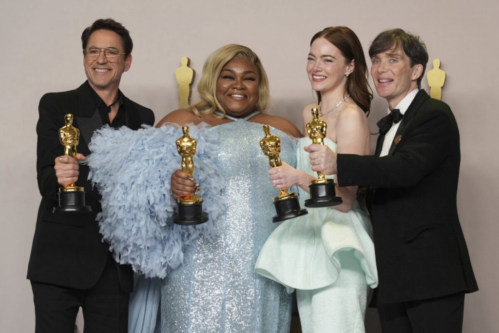 Robert Downey Jr., winner of the award for greatest efficiency by an actor in a supporting function for “Oppenheimer,” from left, Da’Vine Pleasure Randolph, winner of the award for greatest efficiency by an actress in a supporting function for “The Holdovers,” Emma Stone, winner of the award for greatest efficiency by an actress in a number one function for “Poor Issues,” and Cillian Murphy, winner of the award for greatest efficiency by an actor in a number one function for “Oppenheimer,” pose within the press room on the Oscars on Sunday, March 10, 2024, on the Dolby Theatre in Los Angeles.