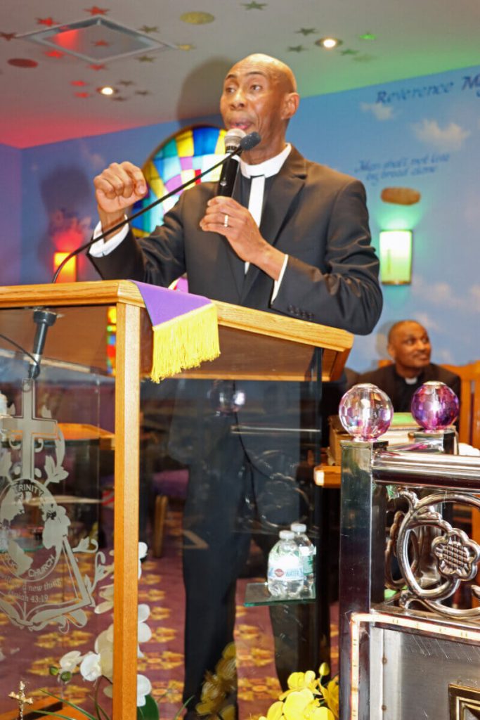 Pastor Edwert “Ed” Jeffers pays tribute to Alleyne DeRoche at her funeral on Feb. 24 at Religion Apostolic Church on Pacific Avenue in Crown Heights, Brooklyn.