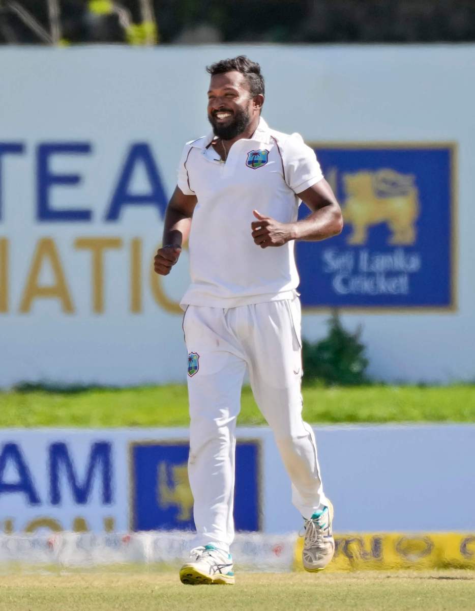 West Indies bowler Veerasammy Permaul celebrates taking the wicket of Sri Lanka’s Angelo Mathews through the fourth day of their second take a look at cricket match in Galle, Sri Lanka, Thursday, Dec. 2, 2021.
