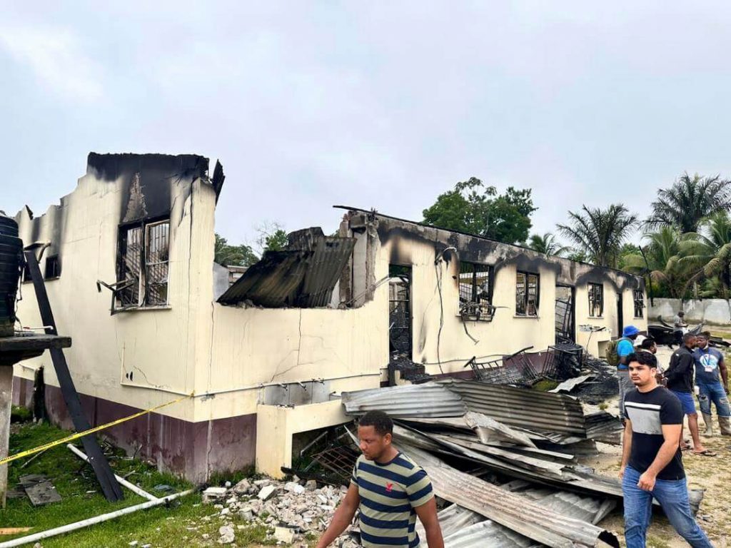 On this picture offered by Guyana’s Division of Public Info, the dormitory of a secondary faculty is burned in Mahdia, Guyana, Monday, Could 22, 2023. A nighttime fireplace raced via the dormitory early Monday, killing not less than 20 college students and injuring a number of others, authorities stated.