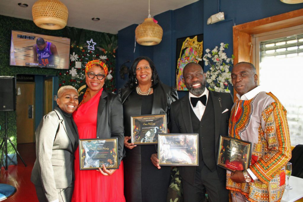 Proprietor of Bleu Fin Bar & Grill, Hollis Barclay, left, with honorees, Petula Hanley, Democracy Past Elections Coalition, supervisor on the Participatory Budgeting Mission, Oma Halloway, chief operations officer of Bridge Avenue Improvement Company, Reverend Dr. David Ok. Allen, founding father of Epic Village Neighborhood Improvement Corp, and Reverend Dr. Clive E. Neil, pastor of Bedford Central Presbyterian Church, after being honored on the 633 Nostrand Ave., Brooklyn location, Feb. 25.