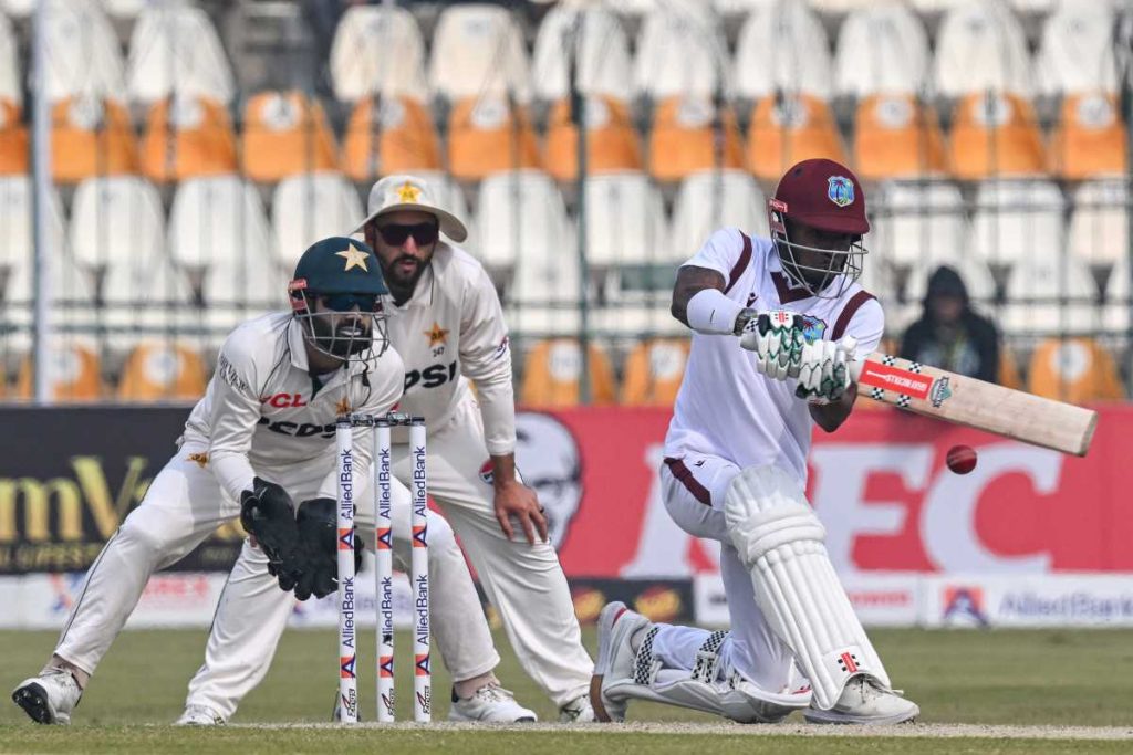 West Indies’ Alick Athanaze (R) performs a shot in the course of the third day of the primary Check cricket match between Pakistan and West Indies on the Multan Cricket Stadium in Multan on Jan. 19, 2025.