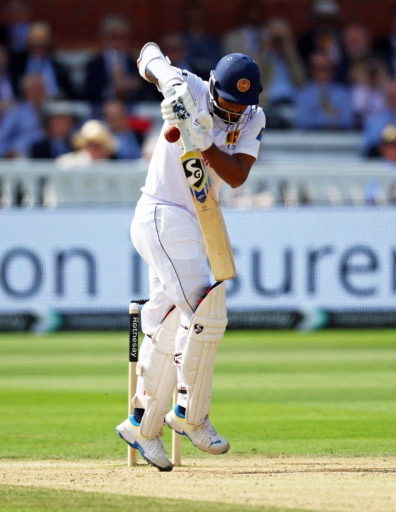 Sri Lanka’s Dimuth Karunaratne in motion earlier than dropping his wicket, caught out by England’s Jamie Smith off the bowling of Olly Stone Motion in the course of the Second Check of England v Sri Lanka at Lord’s Cricket Floor, London, Britain, Sept. 1, 2024.