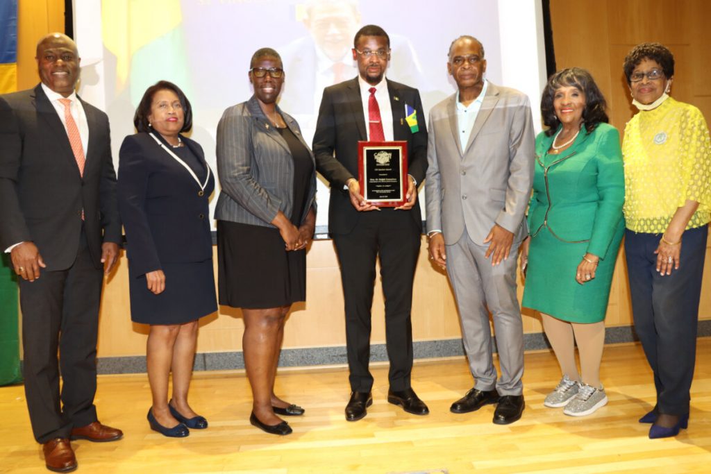 St. Vincent and the Grenadines Consul Basic to america Rondy “Luta” McIntosh, heart, receives plague, on behalf of Vincentian Prime Minister Dr. Ralph E. Gonsalves, from Dr. Ken Irish-Bramble, to McIntosh’s left, chair of Brooklyn’s Medgar Evers School’s (MEC) Caribbean Analysis Heart, in June 2023 in commemorating Caribbean-American Historical past Month at MEC.