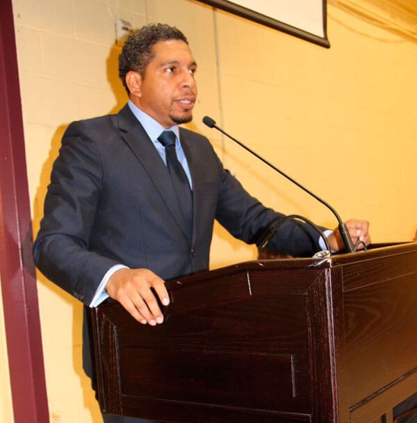St. Vincent and the Grenadines Minister of Financial Planning Camillo Gonsalves addresses a city corridor assembly in new York.