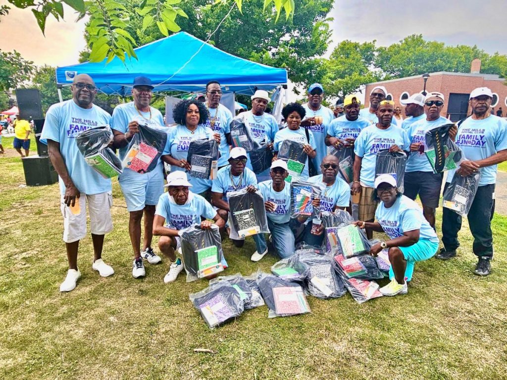 Third from left again row is Doris Rodney, founder, and members of the Hills Social Membership, holding faculty provides donated to college students through the very first Brooklyn/Queens Linkup Household day on July 28, in Canarsie Park on Seaview Avenue