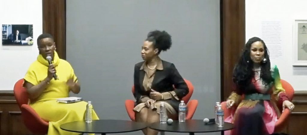 From left: Moderator Jenna Flanagan, Dr. Uche Blackstock, and Dr. Aletha Maybank, seated on stage through the digital occasion, celebrating Dr. Blackstock’s e-book Legacy, hosted by the Brooklyn Public LIbrary’s Heart for Brooklyn Historical past (BPL-CBH) on April 10, 2024.
