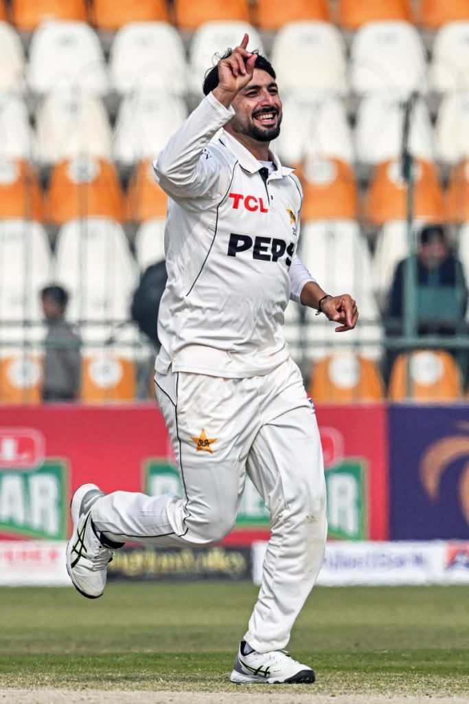 Pakistan’s Abrar Ahmed celebrates after taking the wicket of West Indies’ Tevin Imlach throughout the third day of the primary Take a look at cricket match between Pakistan and West Indies on the Multan Cricket Stadium in Multan on Jan. 19, 2025.