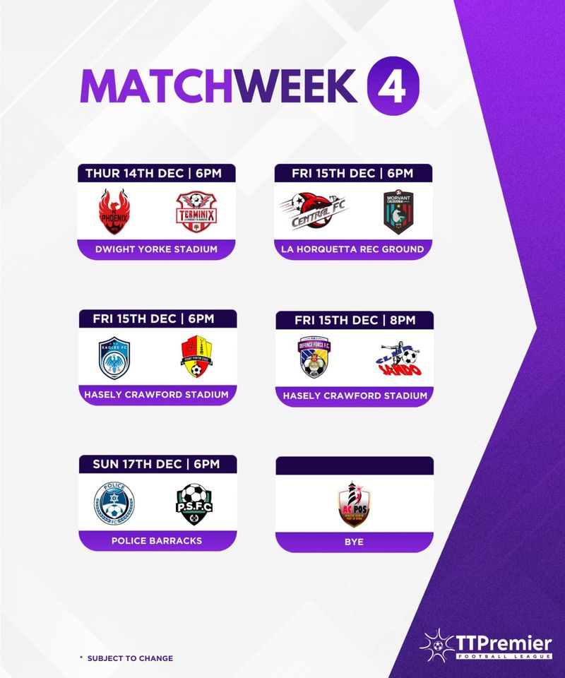 The match fixtures for the Trinidad and Tobago Premier Soccer League for the 4th week of the match have been declared.