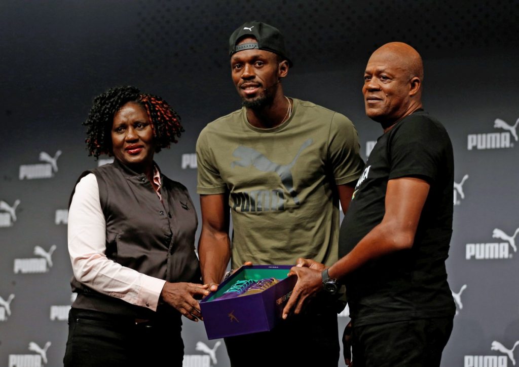 Jamaica’s Usain Bolt along with his mom, Jennifer Bolt and father, Wellesley Bolt through the press convention in London, Britain, Aug. 1, 2017.