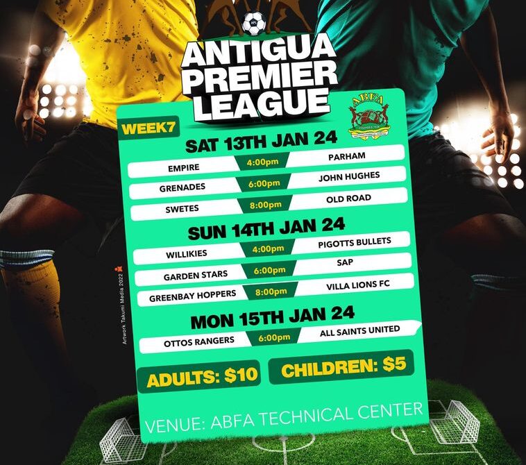 Week 7 of the Antigua Premier League will start on Saturday, thirteenth January 2024 and can conclude on Monday, fifteenth January 2024. The tournaments can be carried out on the ABFA Technical middle.