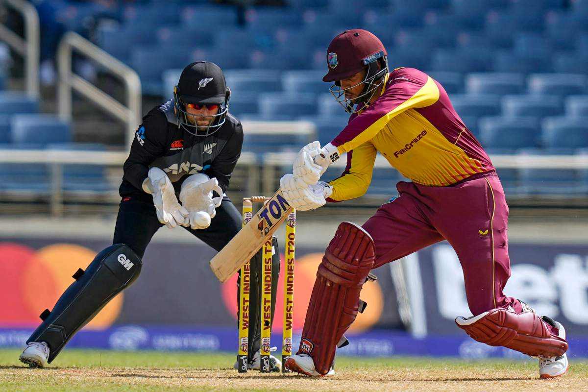 West Indies’ Brandon King performs a shot towards New Zealand in the course of the third T20 cricket match at Sabina Park in Kingston, Jamaica, Sunday, Aug. 14, 2022.