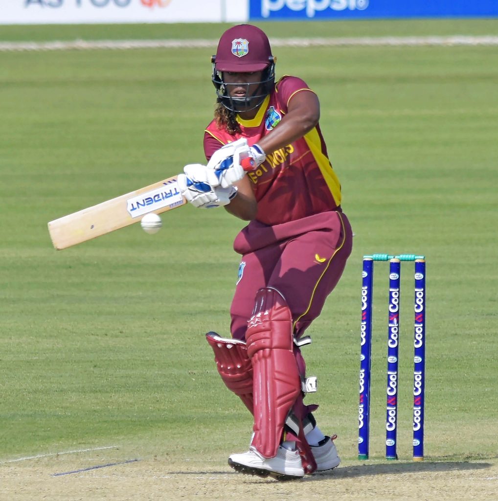 Hayley Matthews of West Indies performs a shot through the first One-Day Worldwide cricket match towards Pakistan on the Nationwide Stadium in Karachi, Pakistan, Monday, Nov. 8, 2021.