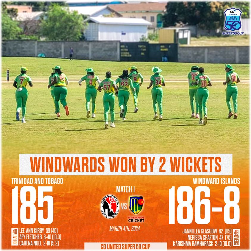 Windwards Afy Fletcher took 3 wickets for 40 runs and Carena Noel took 2 wickets for 18 runs, the Windwards made the Trinidad and Tobago staff again to the pavilion for 185 runs within the forty ninth over.
