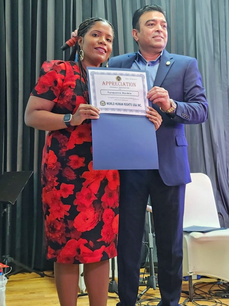 Turquoise Haskin Esq. candidate for Civil Courtroom Decide, Kings County, Brooklyn, being introduced with a Certificates of Appreciation from the organizer Saghir Khan on the WHRUSA 2024 2nd Conference and Cultural Present at Queens Palace in Woodside on Oct. 19.